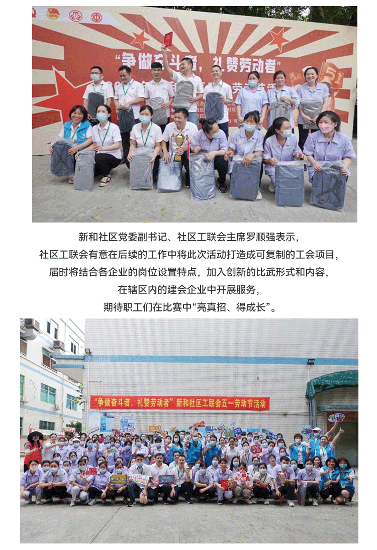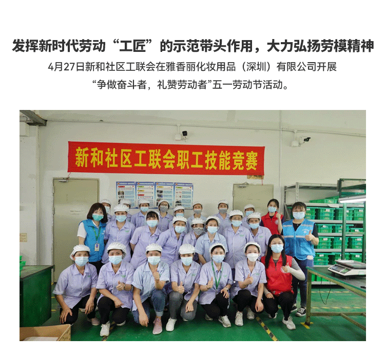 發(fā)揮新時(shí)代勞動(dòng)"工匠"的示范帶頭作用,大力弘揚(yáng)勞模精神;新和社區(qū)工聯(lián)會(huì)在雅香麗化妝用品(深圳)有限公司開展 “爭(zhēng)做奮斗者,禮贊勞動(dòng)者”五一勞動(dòng)節(jié)活動(dòng)。